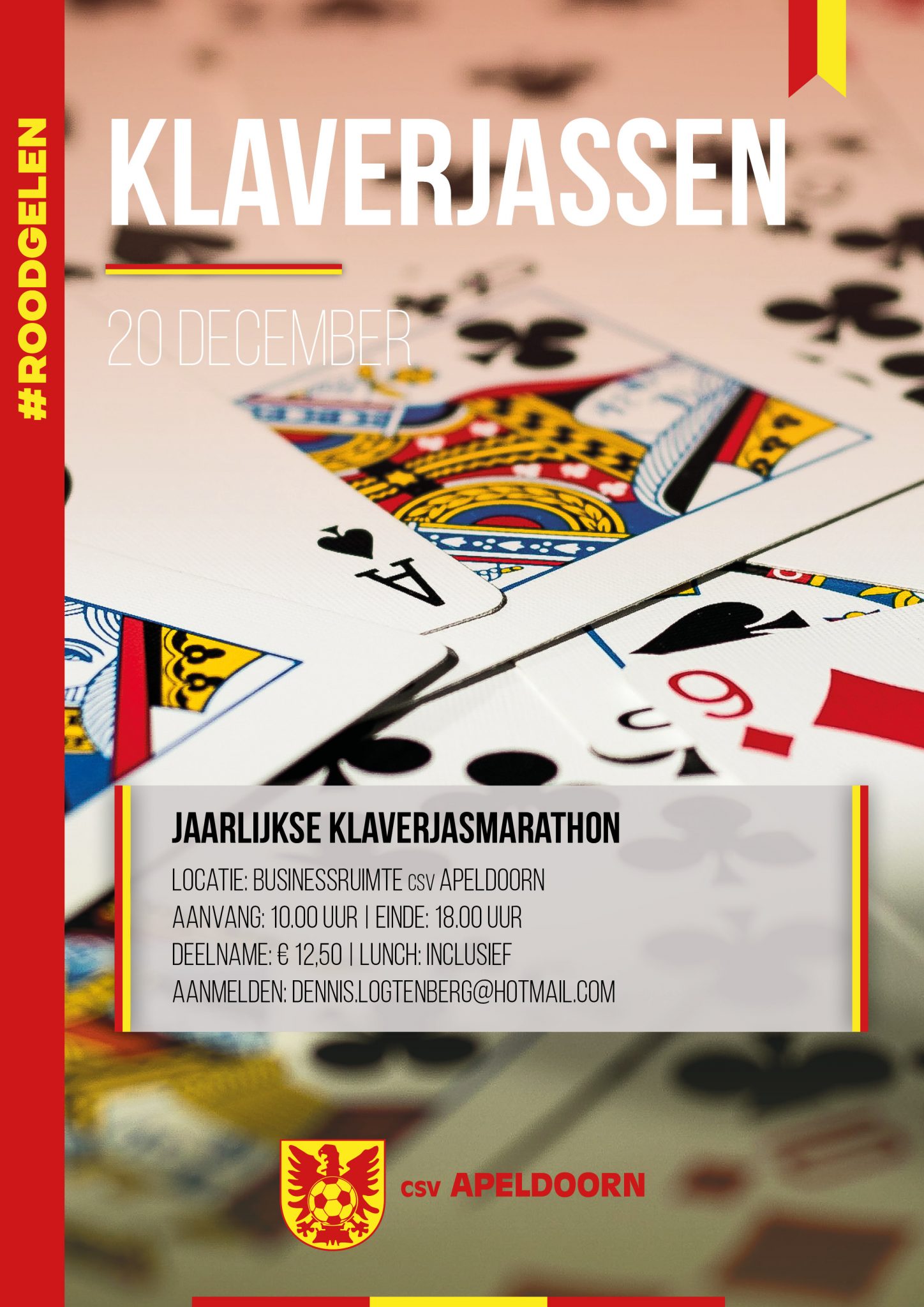 Ook dit jaar wordt er een klaverjasmarathon georganiseerd. Het evenement zal plaatsvinden op zaterdag 20 december. Mocht je mensen kennen die ook mee willen doen, zijn deze van harte uitgenodigd. We hopen u allen weer te verwelkomen.