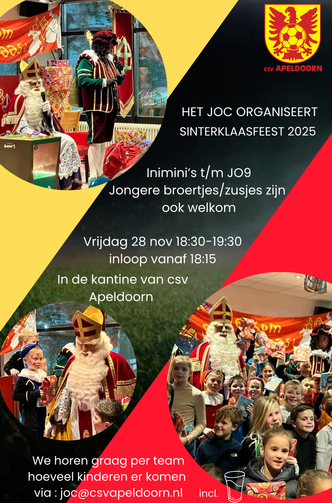 Sinterklaas wil graag weten hoeveel cadeautjes hij mee moet nemen, dus meld je snel aan per team via joc@csvapeldoorn.nl.